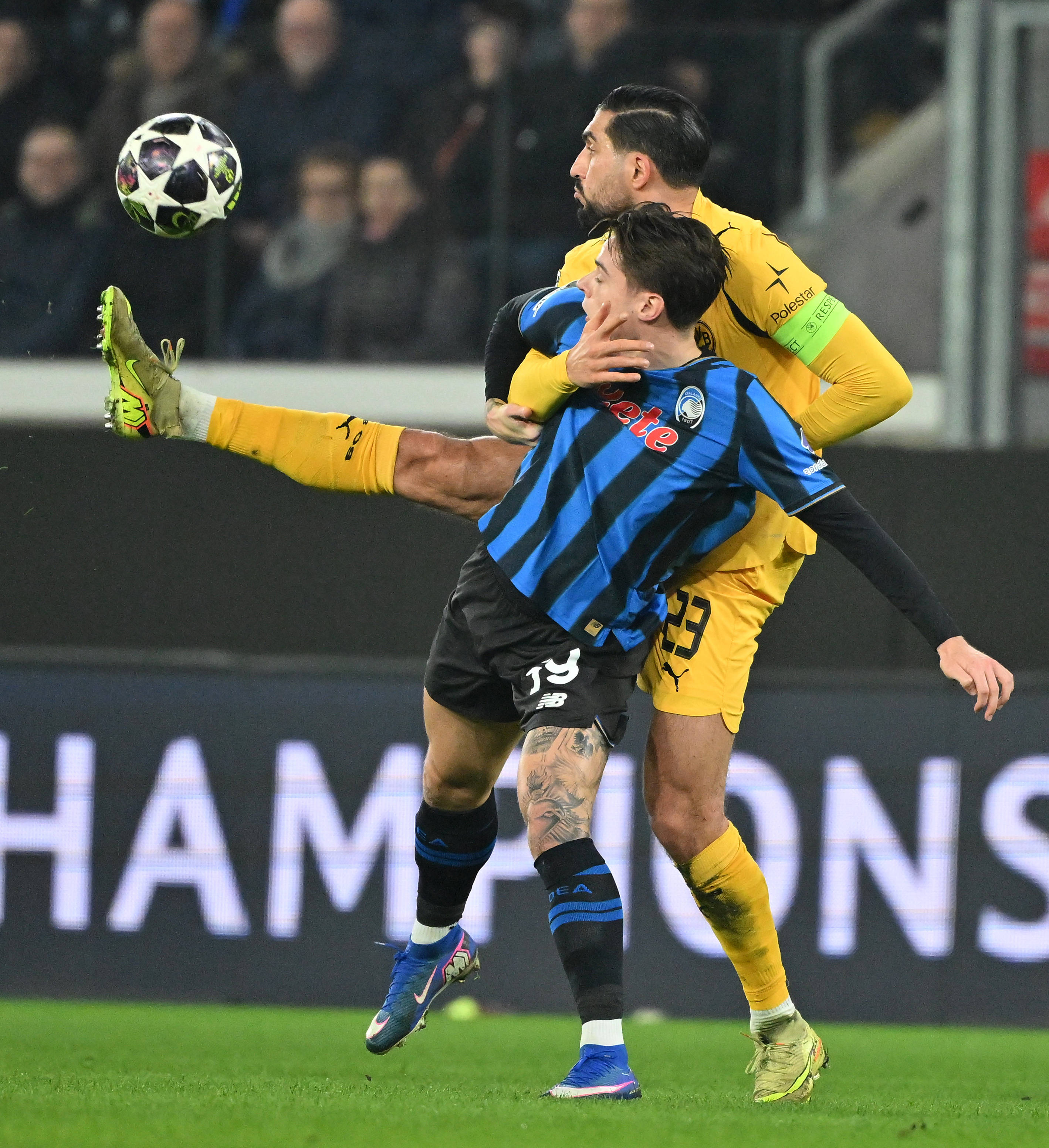 2月25日,多特蒙德队球员埃姆雷·詹(右)与亚特兰大队球员扎莱夫斯基在比赛中拼抢。 新华社发(阿尔贝托·林格利亚摄)