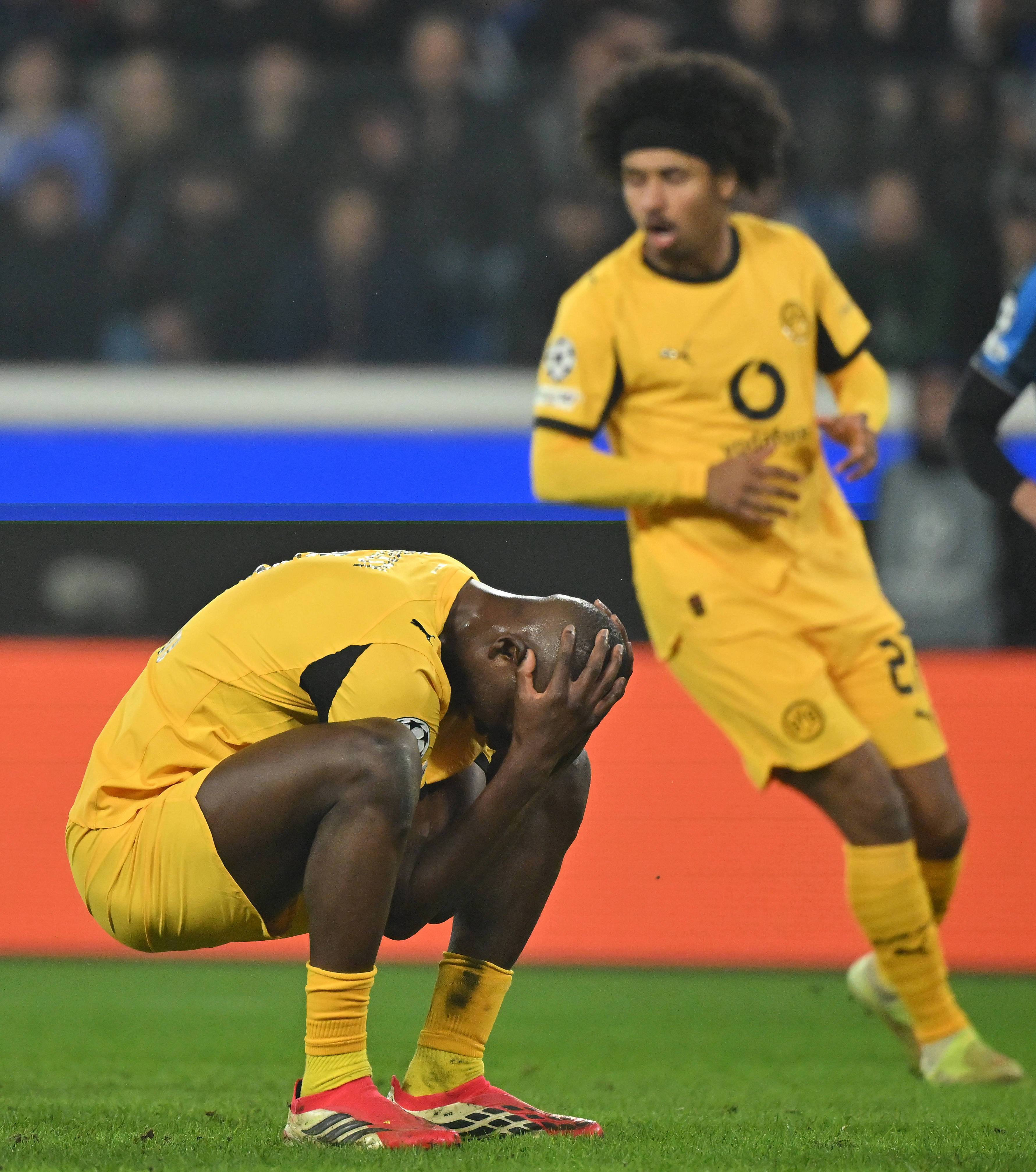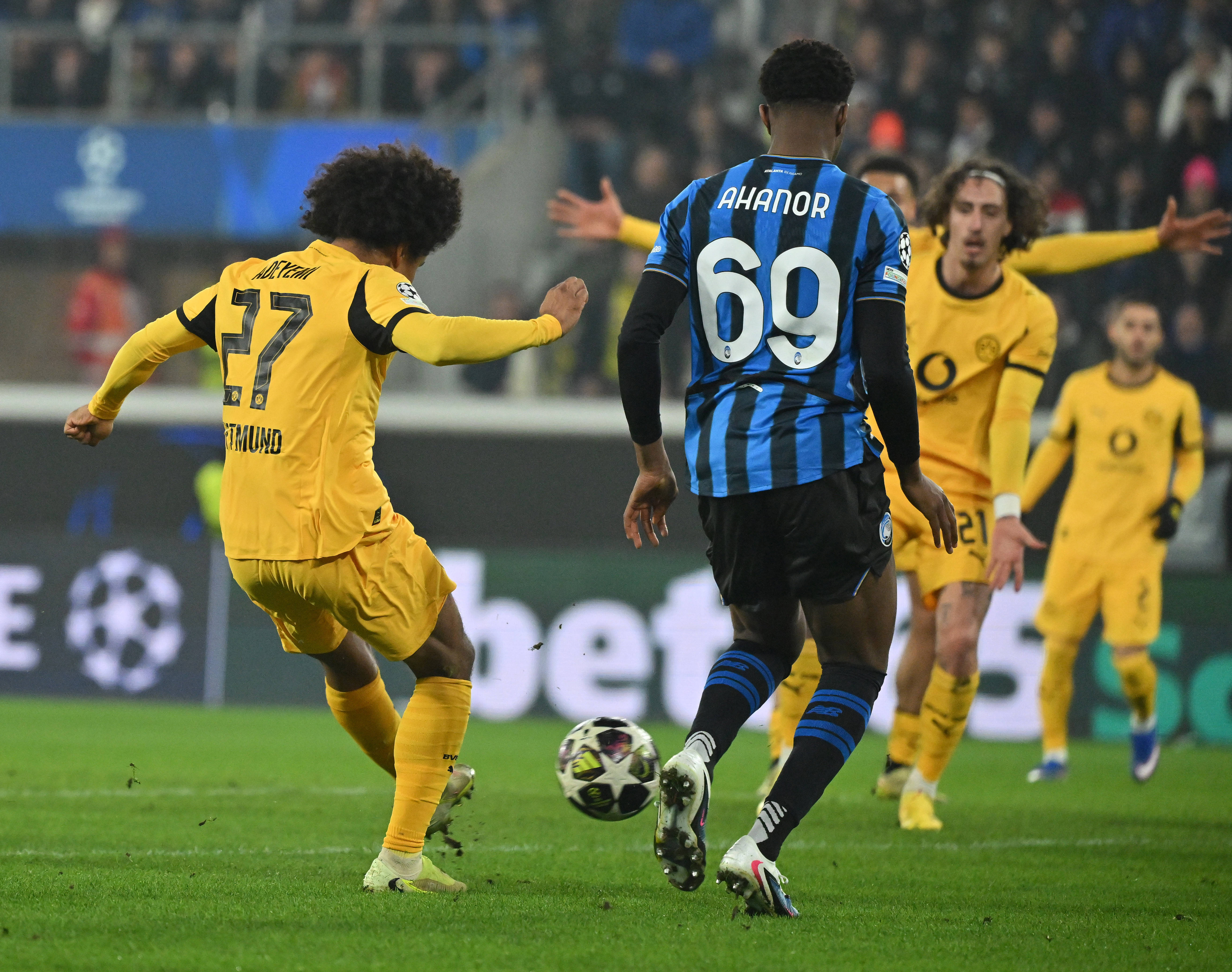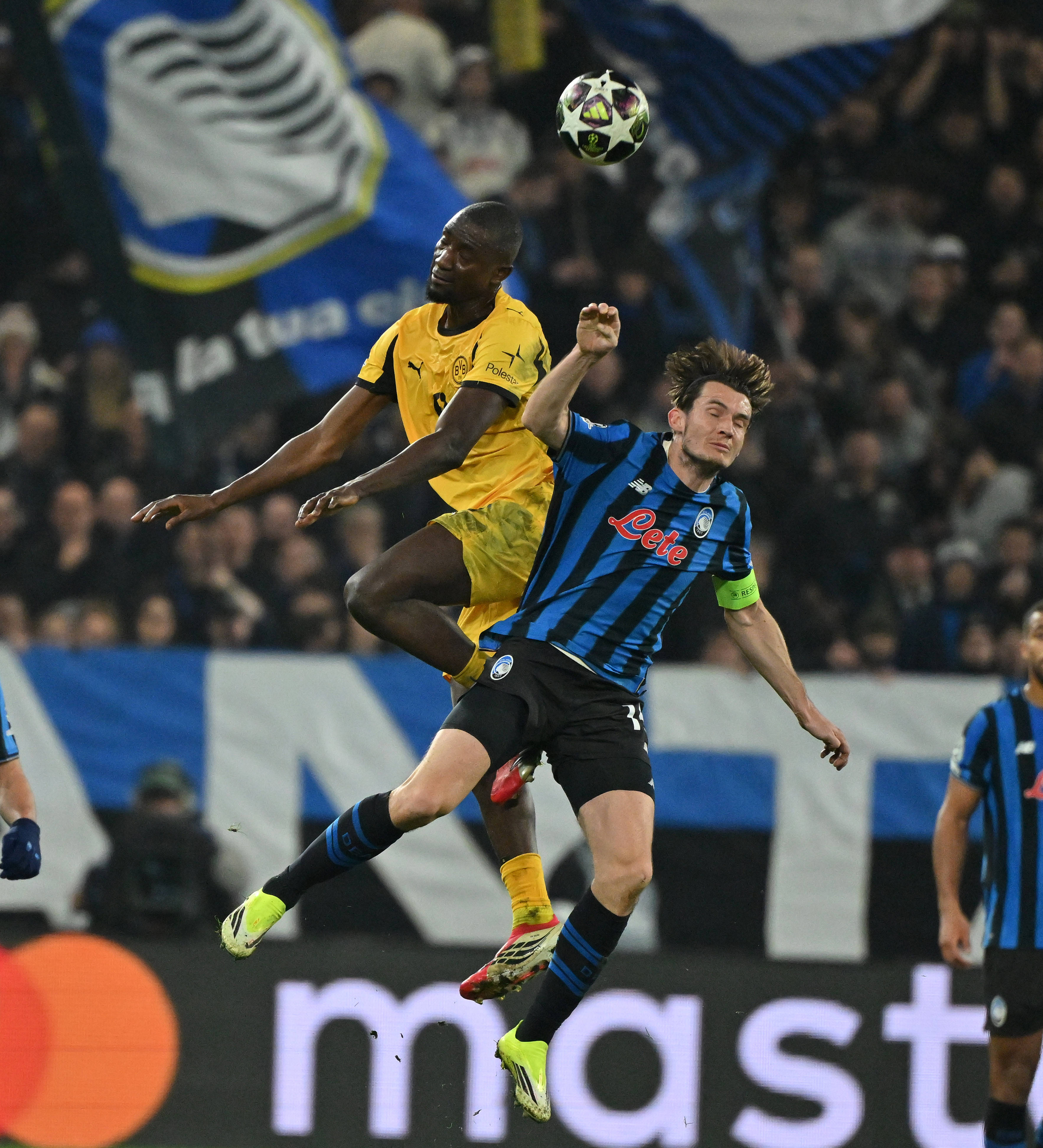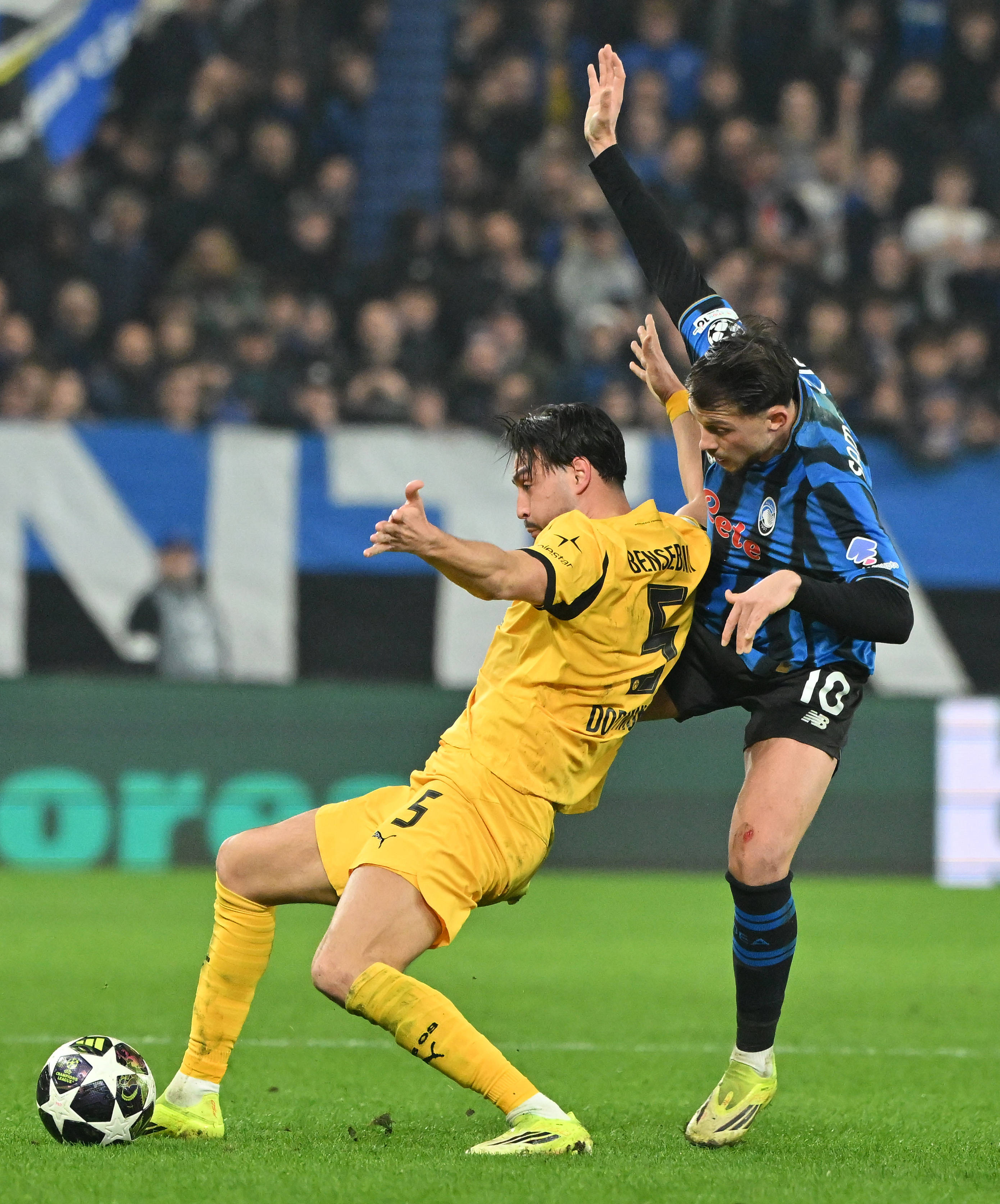 2月25日,多特蒙德队球员本塞拜尼(下)与亚特兰大队球员扎帕科斯塔在比赛中拼抢。 新华社发(阿尔贝托·林格利亚摄)