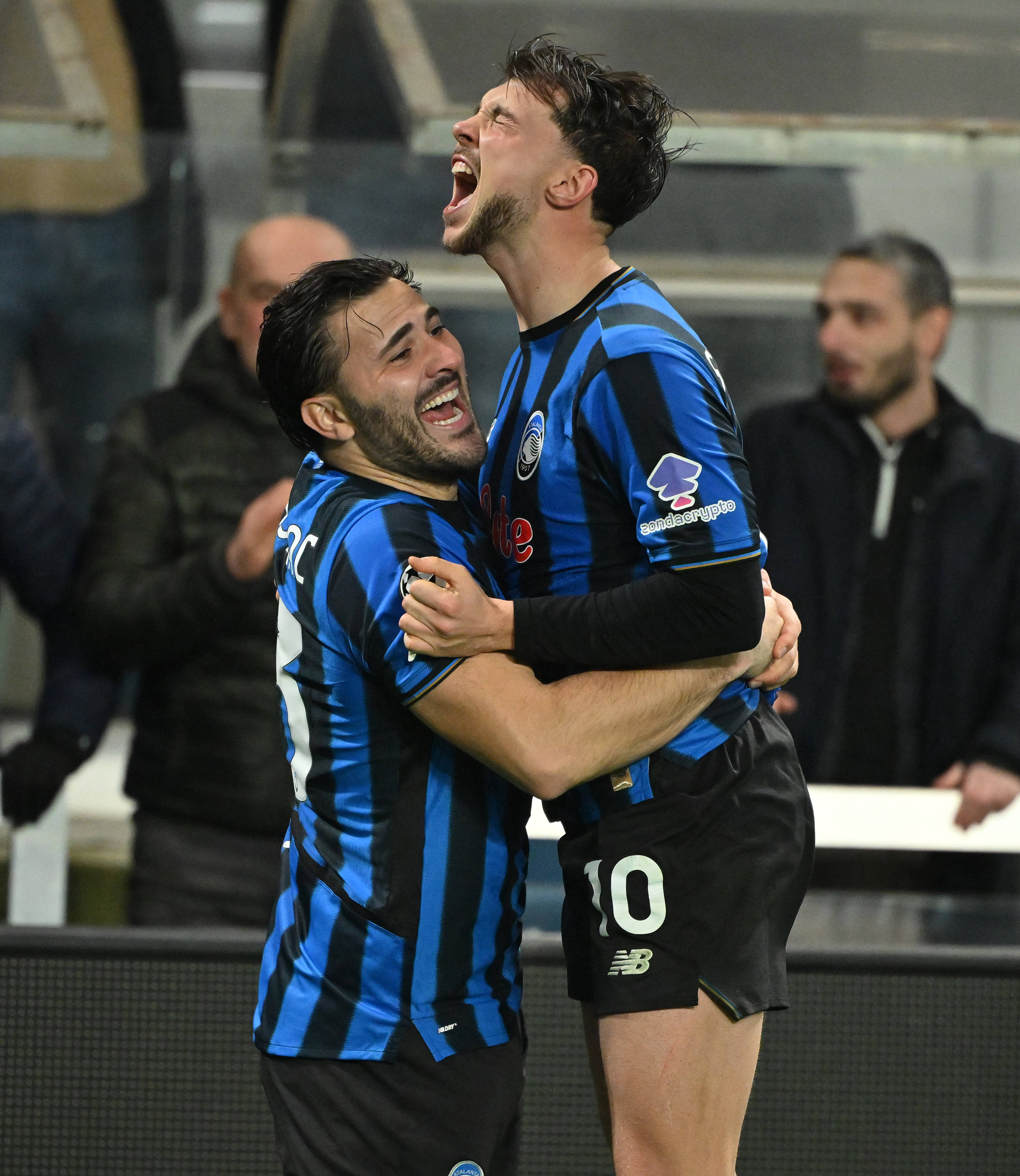 2月25日,亚特兰大队球员帕萨利奇(左)庆祝进球。 新华社发(阿尔贝托·林格利亚摄)