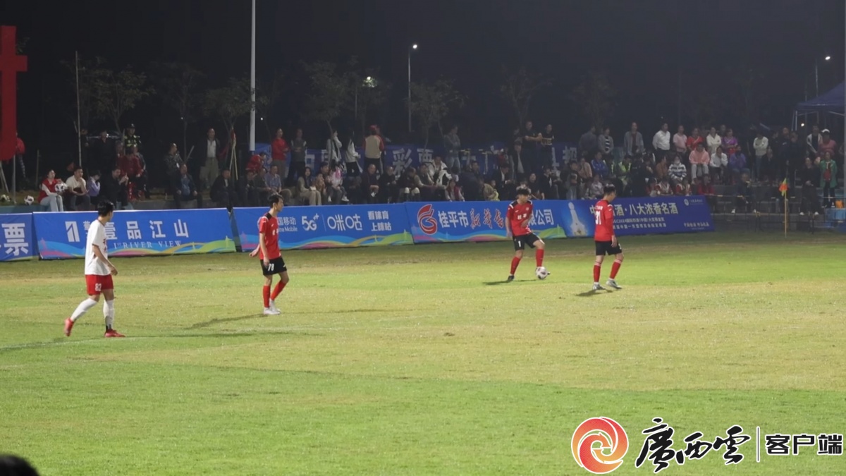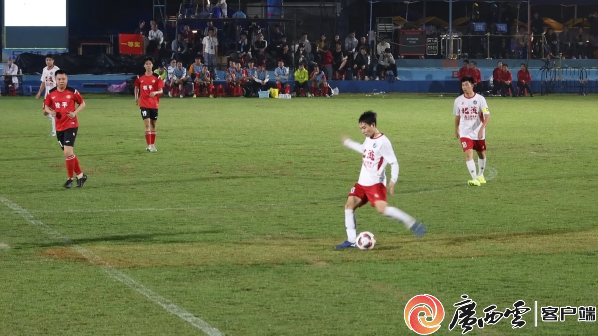 晚上7点,比赛一开场,双方球员就展开了激烈的攻防战,第12分钟,北流市队球员利用角球机会头球破门,取得领先。仅仅过了7分钟,在前场混战中,北流市队球员抓住机会,再次敲开桂平市队大门。两球落后的桂平市队士气受挫,防守出现诸多漏洞,第29分钟,桂平队球员在拼抢解围中将球回传给守门员,造成乌龙球,大比分0:3落后。北流市队势如破竹,3分钟后,再打入一球。上半场结束,桂平市队0:4落后北流市队。