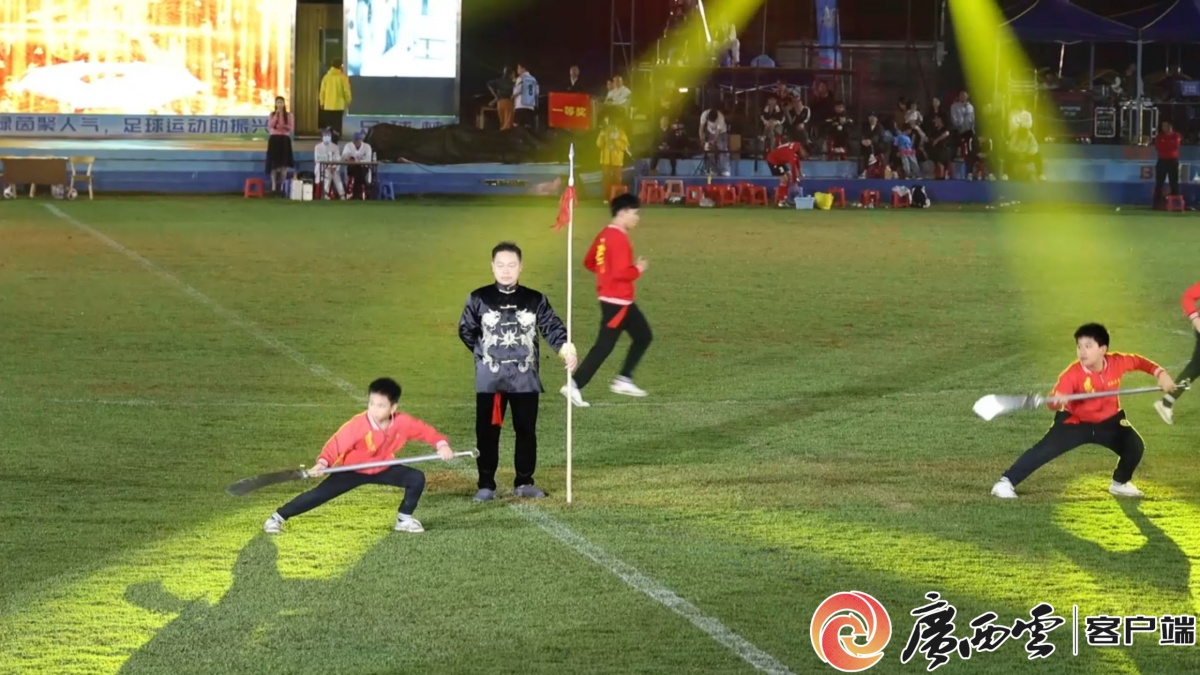 赛前,舞龙舞狮、歌舞《歌满坡》等极具桂平地方特色的节目轮番上演,瞬间点燃了现场氛围。特邀演员甘伟雄惊艳亮相,献唱了经典的《上海滩》与《南粤精武魂》,赢得满堂喝彩。中场休息期间,武术表演《尚武传承》登台,演员们刚劲有力的招式,再次引发现场掌声雷动。