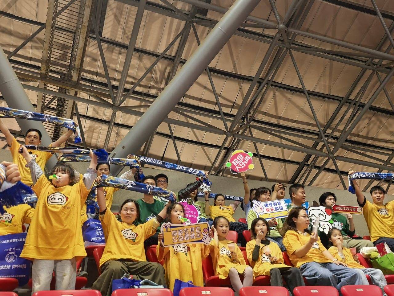 金华队首个主场比赛日,金华队以4:0大胜舟山队。金华市体育中心赛场内外,体彩元素全场景覆盖:LED大屏滚动播放安心购彩海报,通道和看台张贴着公益宣传标语。一支由代销者、购彩者、球迷共同组成的“乐小星观球小分队”手持助威道具,成为看台上一道温暖的风景线。候场区“公益体彩 一起上场”品牌活动,通过趣味互动、拍照打卡、预测比分等形式,让球迷近距离感受体彩的活力与温度。