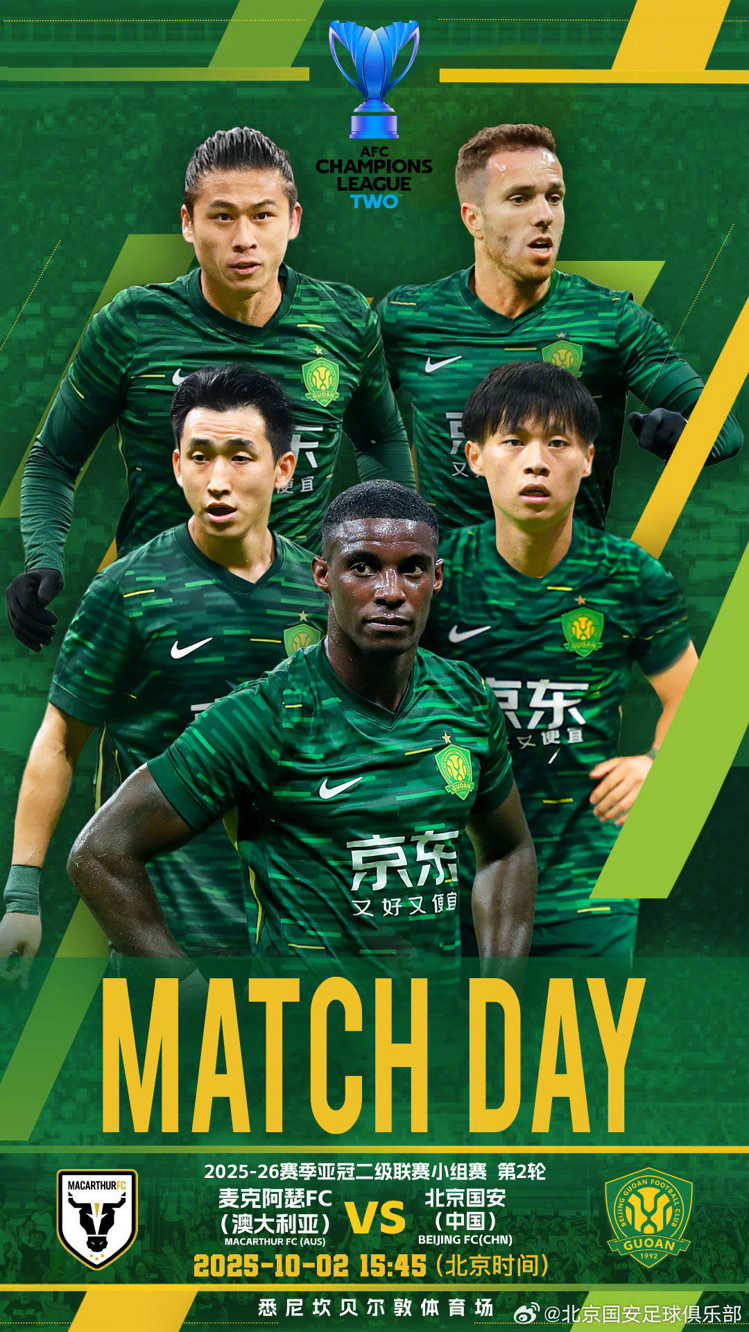 北京时间10月2日(今日)下午15时45分,2025-2026赛季亚冠二级联赛小组赛E组第二轮的一场对决在澳大利亚悉尼坎贝尔敦体育场上演,中超御林军北京国安远赴澳洲,客场对决澳超球队麦克阿瑟FC。
