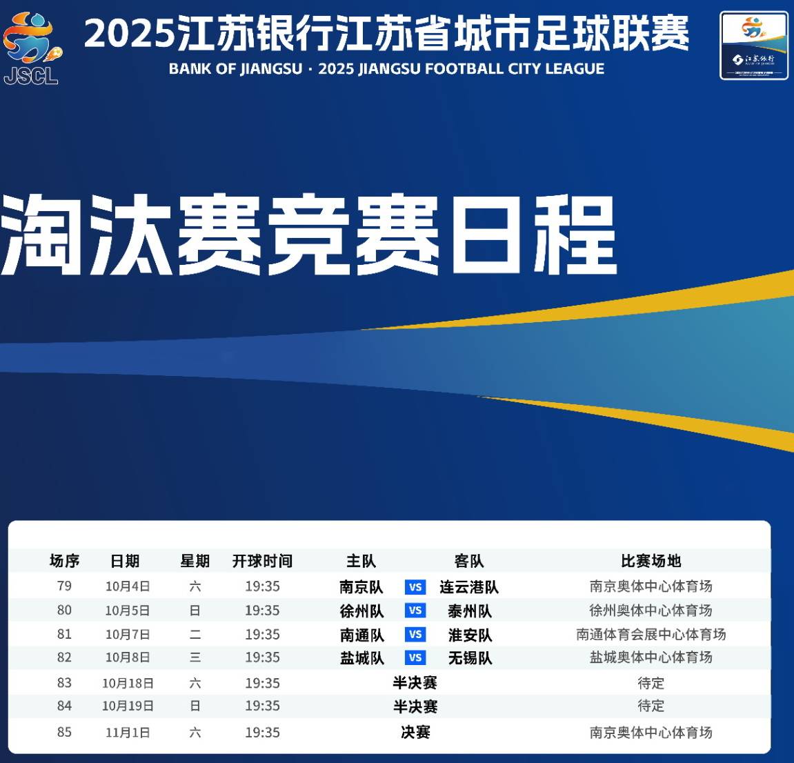 2025-10-04足球直播,欧洲杯直播,体育直播,球客直播,雷速体育,篮球直播,风驰直播,NBA直播,英超直播,足球比分,足球赛事,意甲,欧冠,世界杯,世界杯直播,村超,贵州村超,波胆,角球,串球,大小球2025江苏省城市足球联赛(苏超)的号角已经吹响,激动人心的淘汰赛阶段即将震撼上演。本次淘汰赛不仅在赛制上进行了多项升级,央视体育频道CCTV5也将直播多场焦点之战,为全国球迷带来一场足球盛宴。虽然本周至10月5日的赛程已定,但下周的比赛安排依然充满未知,为赛事增添了几分神秘色彩。