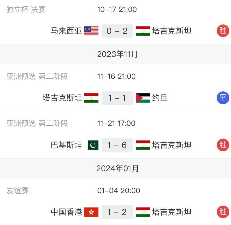 与此形成鲜明对比的是,塔吉克斯坦队在最近的四场比赛中表现抢眼,取得了3胜1平的战绩。其中,他们在两场正式比赛中保持胜利,最近一场热身赛中以2-1战胜了中国香港队。此外,塔吉克斯坦队还在正式比赛中击败了巴基斯坦队和马来西亚队。这一系列的胜利为他们在亚洲杯上首战国足增添不小信心。