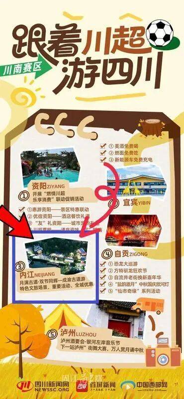 宣传端,内江依托省市级媒体及自有新媒体平台,推出“跟着川超游内江” “威远特产T台秀” “资中趣味啦啦队”“隆昌城市变身”等创意短视频,通过直播、图文海报等形式,报道各景区景点的客流情况、精彩瞬间以及特色亮点,营造“打川超、看川K、游内江”的热闹氛围,进一步提升内江文旅知名度与美誉度。
