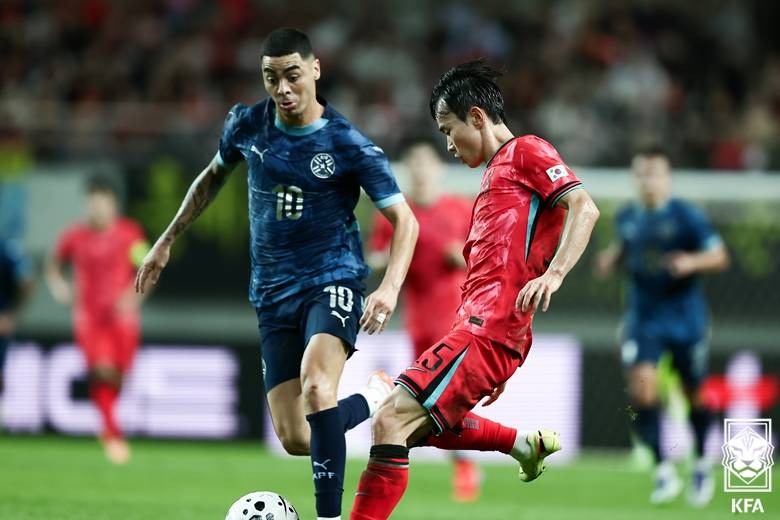 本场比赛,洪明甫对首发阵容进行了轮换,金承奎取代赵贤祐出任首发门将,李韩汎和朴镇燮取代曹侑珉和金朱晟与金玟哉搭档,而且金玟哉是打到了左边中卫的位置上,朴镇燮踢到了上轮金玟哉的中后卫位置上。而在中场方面,金镇圭取代白昇浩,李东炅取代李刚仁进入首发,小将严智星也取代了李在城首发。最大的变化来自于边后卫,大田的老将组合金纹焕、李明载取代了年轻的薛英佑和李太锡进入首发。可以说除了孙兴慜、金玟哉和黄仁范外,韩国队用了8人的大轮换来应对这场比赛,而很显然,洪明甫试阵的目的很明确,也并没有像对阵巴西那样对待巴拉圭。