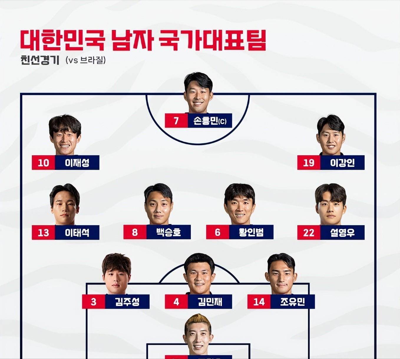审视双方的排兵布阵,韩国队主教练显然心存忌惮,开场便祭出 5-4-1 的“铁桶阵”,意图固守后伺机反击。门将赵贤佑严阵以待,李太锡和薛英佑两翼回撤,几乎化身为边后卫。中卫线上,金玟哉搭档金朱晟与曹侑珉,构筑三道防线。中场李刚仁、黄仁范等人严丝合缝地封锁中路,只留下孙兴慜一人在前场孤军奋战,等待反击的渺茫机会。即便如此严密的防守,在巴西队凌厉的攻势面前,却显得如此不堪一击。