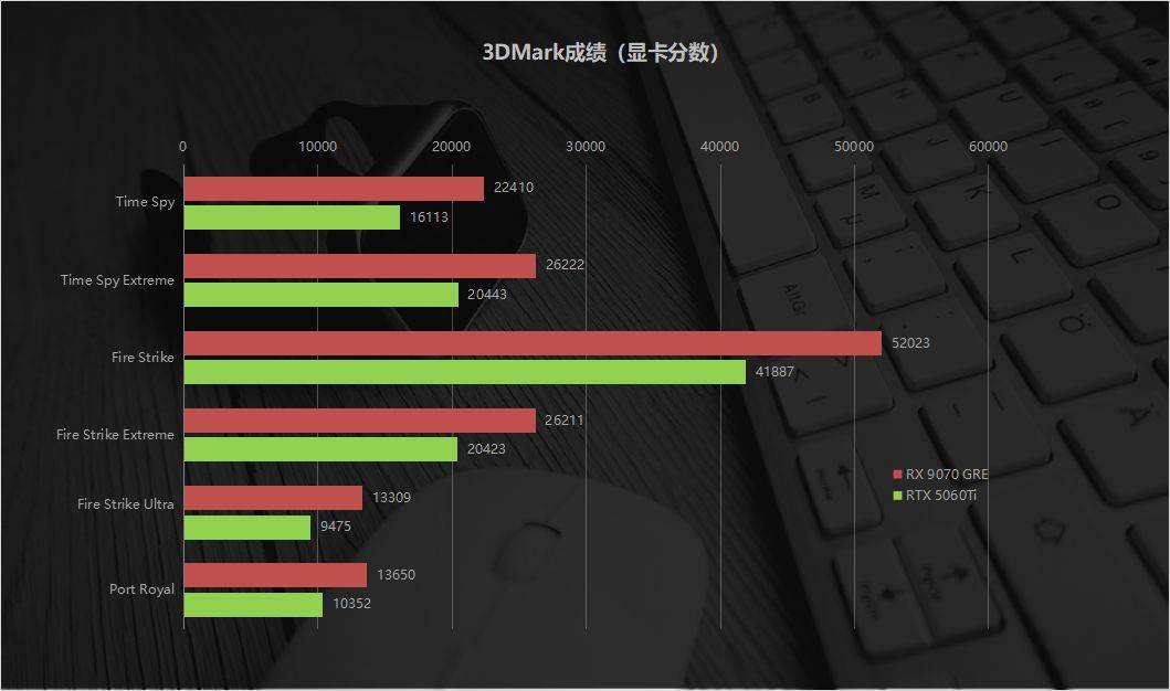 FireStrike系列(DX11场景)中,最大领先幅度超过了40%,最小也有24%;TimeSpy系列(DX12场景)的综合领先幅度稳定在30%左右。即便在Port Royal这样的光追测试项目中,RX 9070 GRE也以接近32%的优势胜出,打破了NVIDIA在光追基准测试中的传统优势。所有测试项目平均下来,RX 9070 GRE领先幅度足足有32.04%,这么大的差距真的很出人意料。你真的会开始自我怀疑,这真的是同价位的产品吗?
