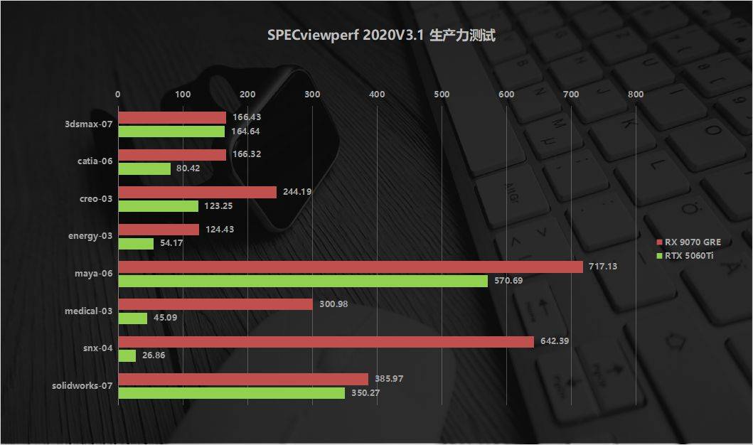 测试结果呈现一边倒的态势:尽管RTX 5060 Ti 16GB拥有16GB大显存,但RX 9070 GRE凭借RDNA 4架构开放的专业显卡功能,在绝大多数场景中实现了碾压式领先。其中,在catia-06(工业设计)、energy-03(能源分析)等场景中,RX 9070 GRE的领先幅度超过100%;snx-04(CAD/CAM/CAE应用)场景的性能差距更是达到惊人的20倍以上。综合全部测试项目,RX 9070 GRE的生产力性能平均领先RTX 5060 Ti 16GB高达403%,无论是3D渲染、视频编辑还是工程建模,都能显著提升工作效率。