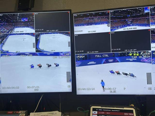 事实上,自2018年起,VAR(视频回放系统)便已进入奥运赛场,历经数年发展,如今已配备更多摄像头、更高清的画面以及更快速的响应机制。在国际滑联(ISU)短道速滑主管、前奥运冠军雨果·亨霍夫的邀请下,我走进了被裁判戏称为“防空洞”的VAR房间——这里是连教练员和运动员都无法进入的密室。