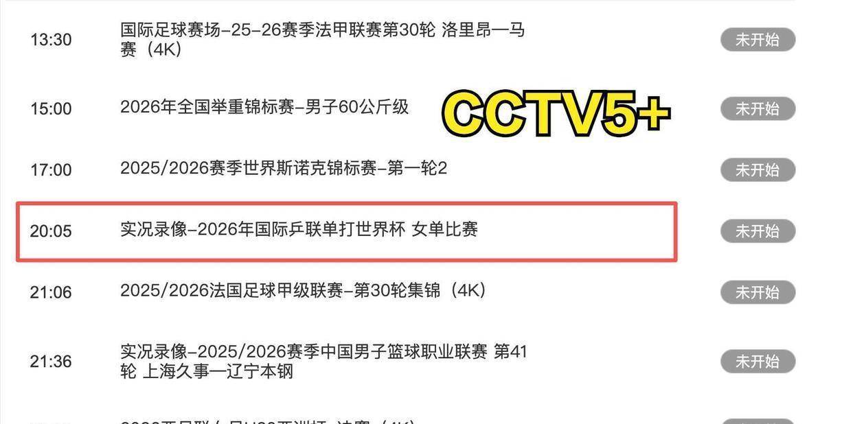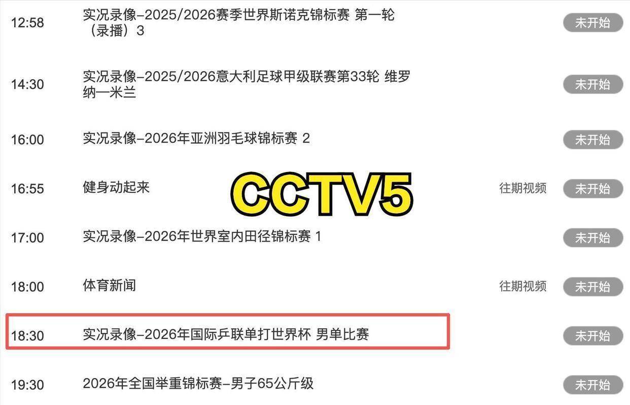根据央视的节目安排,4月21日晚上,球迷们可以在电视上重温国乒在单打世界杯上的表现。 具体时间是晚上6点30分,CCTV5频道播出了《实况录像-2026年国际乒联单打世界杯 男单比赛》。 紧接着在晚上8点05分,CCTV5+频道播出了女单比赛的实况录像。 这些比赛录像的播出,被看作是大赛前帮助球迷回顾国乒选手状态、营造比赛氛围的一种方式。